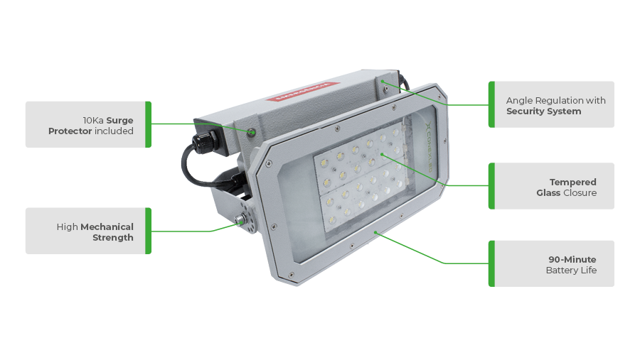 The Armored LED Floodlight with Emergency Module from the Guaecá Line CLG-E(F) is specifically engineered to provide robust and enduring lighting in harsh environments, integrating an emergency module that ensures continued operation during power outages. This floodlight is perfect for industrial settings, hazardous areas, and any locations that demand rugged lighting capable of instantaneous response to electrical disruptions.