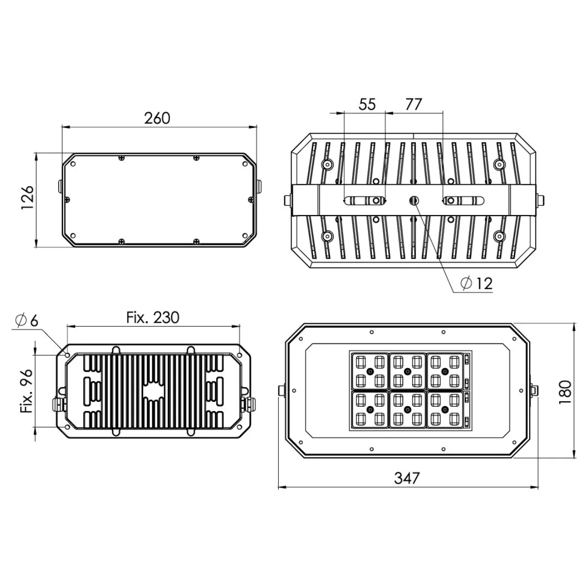 The robustness is reinforced by the design of the die-cast aluminum body and the 4mm tempered glass display, which together provide an IK08 impact rating and an IP67 protection rating, ensuring high resistance to impacts and complete protection against water and dust ingress. The floodlight offers flexibility with various beam opening angles, such as 90° and 60°, suitable for different lighting needs.