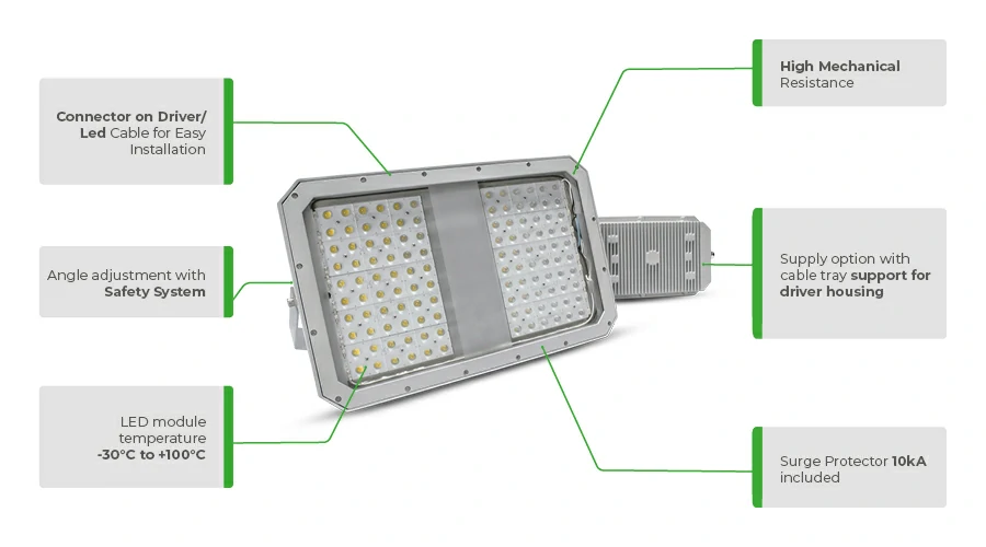 The Armored LED Floodlight for High Temperature Environments from the Guaecá Line, model CLG-HT, has been meticulously designed to deliver superior performance in environments experiencing extreme temperatures. Ideal for applications that require robustness and resilience, this floodlight can operate in ambient temperature conditions ranging from -40ºC to +100°C for the LED modules and up to +60°C for the driver housing, making it perfect for use in industrial areas, warehouses, power plants, and other indoor and outdoor environments.
