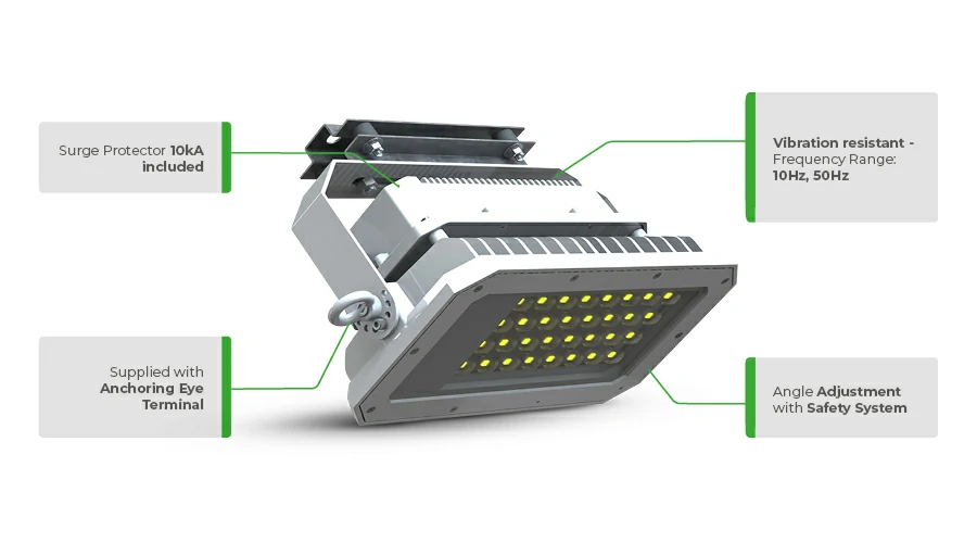 The CLG-SPR(F) from the Guaecá line is an armored LED floodlight equipped with an anti-vibration suspension system, designed to withstand severe environmental conditions including high vibrations. It is ideal for use in industrial areas, ports, and mining operations where robust and reliable lighting is crucial.