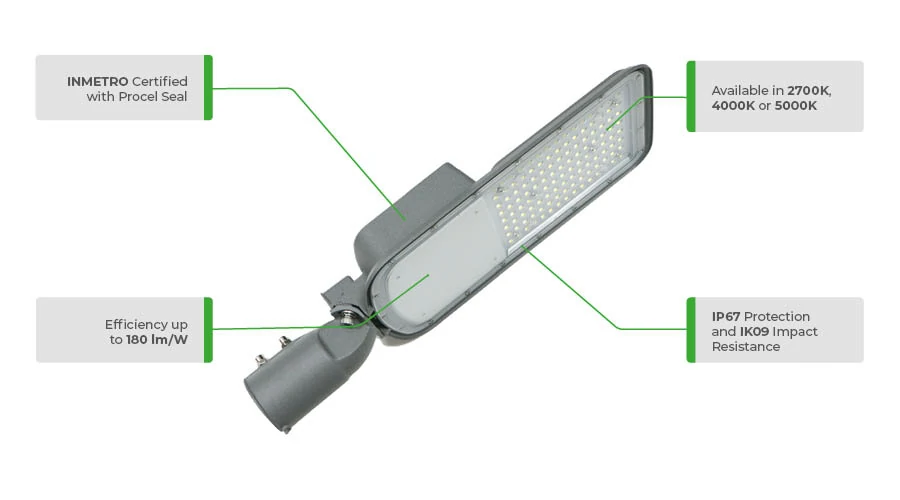 The CLP-A(G) LED street light from the Iporanga line is a high-performance solution certified by INMETRO and awarded the Procel Seal, developed for technical and efficient urban lighting projects. Available in three fixed color temperature options: 2700K, 4000K or 5000K, the customer can select the appropriate configuration for each application. Constructed with an injected aluminum housing and UV-protected polycarbonate lens, it offers high durability, IP67 protection, and luminous efficacy of up to 180 lm/W. Power range from 30W to 200W.