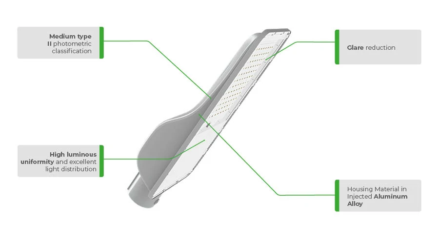 The CLP-A(F) LED public lighting luminaire from the Iporanga line is engineered to provide efficient and reliable lighting for urban environments. It features a housing made of injected aluminum alloy and a UV-protected polycarbonate lens. The internal fin design enhances thermal dissipation and prevents dirt buildup. With a medium Type II photometric classification, the luminaire ensures excellent light distribution and reduced glare. It supports mounting on poles from 48.5 mm to 60.3 mm and comes with built-in surge protection (DPS). Available in power options from 30W to 250W.