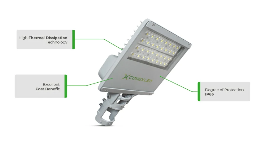 The LED Street Light-Urban of the Juquehy Conexled line provide excellent performance and versatility for applications in parks, squares, condominiums, industries and patios. Modern and bold design with high mechanical strength, simple and safe installation with excellent finish. Glass diffuser and full IP66 degree of protection, including equipment housing. It uses High Power Osram® LEDs suitable for professional lighting and in accordance with IESNA LM-80 guidelines and easy-to-maintain modular LED boards (PCB). Medium type II photometric classification, enabling greater versatility, high luminous uniformity and excellent light distribution, reducing glare and increasing illumination rates. It can be supplied with a base for a PHOTOELECTRIC relay, dimming 1-10 or with a socket for a Telemanagement system.