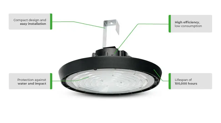 The LED High Bay Industrial Luminaire CLI-H(F) from the Picinguaba Line is designed for pendant installations up to 15 meters high, offering up to 60% energy savings compared to traditional LED High Bay luminaire solutions. Built with a body made of injected aluminum alloy and a polycarbonate lens, it guarantees high luminous efficiency of up to 170 lm/W and an estimated service life of 100,000 hours. Available in 100W, 150W, and 200W versions, it provides different beam angle options (60°, 90°, and 110°) for better light distribution.