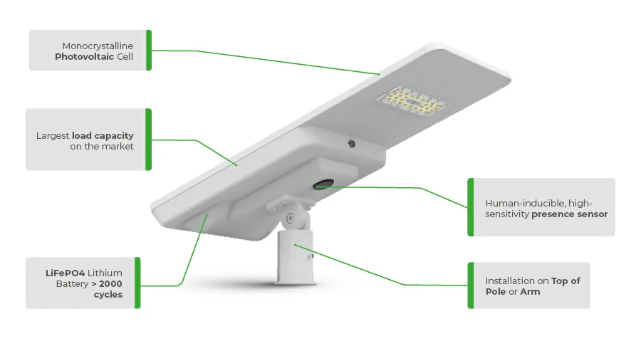Its modular design facilitates maintenance, with waterproof connections color-coded for easy identification, and it is compatible with top-of-pole or arm mounting. The LiFePO4 batteries offer a lifespan of over 2000 cycles, ensuring long-term reliability and durability for the lighting system.