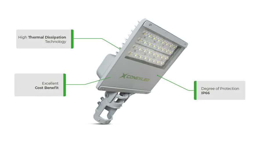 The CLPU-U urban LED luminaire from Conexled’s Juquehy line delivers high luminous efficiency and reliability for public and industrial lighting. Designed with an injected aluminum body, tempered glass diffuser and PMMA optical lens, it features an adjustable mounting bracket (0° to ±20°) for poles and arms from 48.3 mm to 65 mm. Available in power ratings from 24W to 188W, it includes high-power CREE LEDs, IESNA LM-80 compliance, IP66 protection, and IK08 impact resistance. With an estimated service life of 60,000 hours (L70), it ensures high thermal dissipation and supports multiple optics (30°, 60°, 90°, IESNA II).