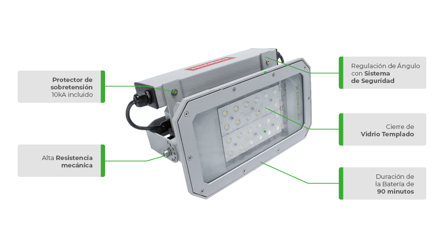 El módulo de emergencia integrado soporta la iluminación por hasta 90 minutos en caso de falla de energía, con una eficiencia luminosa de hasta 150 lm/W, asegurando que áreas críticas permanezcan iluminadas durante emergencias. Esta característica hace del reflector una opción excepcional para aplicaciones que no solo exigen rendimiento y durabilidad, sino también una solución de seguridad integrada.