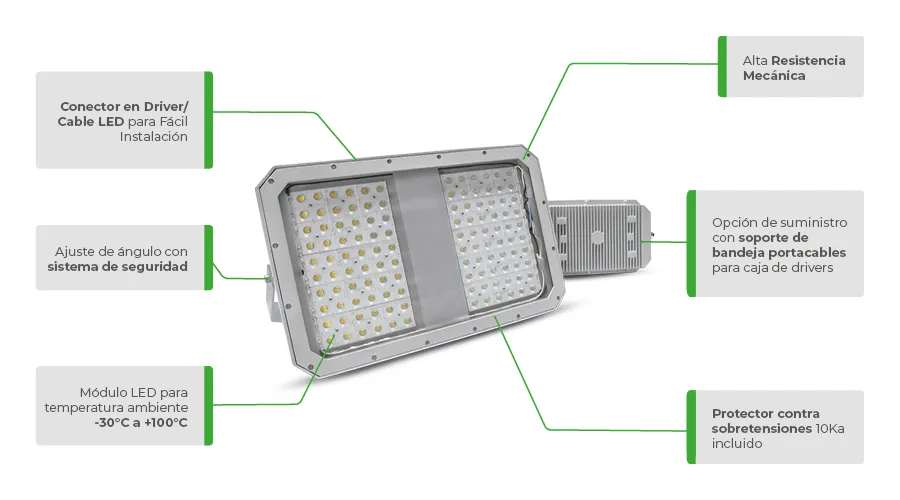 El Reflector LED para Altas Temperaturas de la Línea Guaecá, modelo CLG-HT, ha sido meticulosamente diseñado para ofrecer un rendimiento superior en ambientes que experimentan temperaturas extremas. Ideal para aplicaciones que requieren robustez y resistencia, este reflector puede operar en condiciones de temperatura ambiente que varían de -40ºC a +100°C para los módulos LED y hasta +60°C para el alojamiento del controlador, lo que lo hace perfecto para uso en áreas industriales, almacenes, plantas de energía y otros ambientes internos y externos.