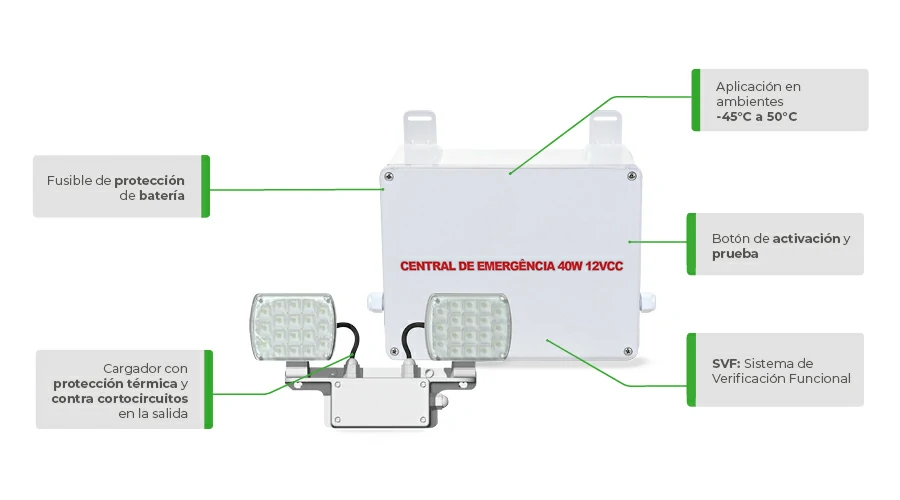 La Línea Juruvaúva Conexled de iluminación de emergencia con sistema centralizado brinda seguridad, robustez y excelente desempeño para aplicaciones en áreas comerciales e industriales, interiores y exteriores, y también para áreas con temperaturas inferiores a 0°C. Carcasa desarrollada en ABS con aditivo antiflama y lente en policarbonato, el sistema centralizado está compuesto por una unidad de iluminación con batería de plomo-ácido regulada por una válvula de asiento, interconectada con un cable de silicona a la iluminación de emergencia centralizada, que tiene la función de despejar o despejar. El centro de iluminación cuenta con un cargador inteligente CC/CV, donde la batería se carga inicialmente con corriente constante y luego de comenzar a flotar, pasa a trabajar con voltaje constante, brindando una mayor vida útil a la batería.