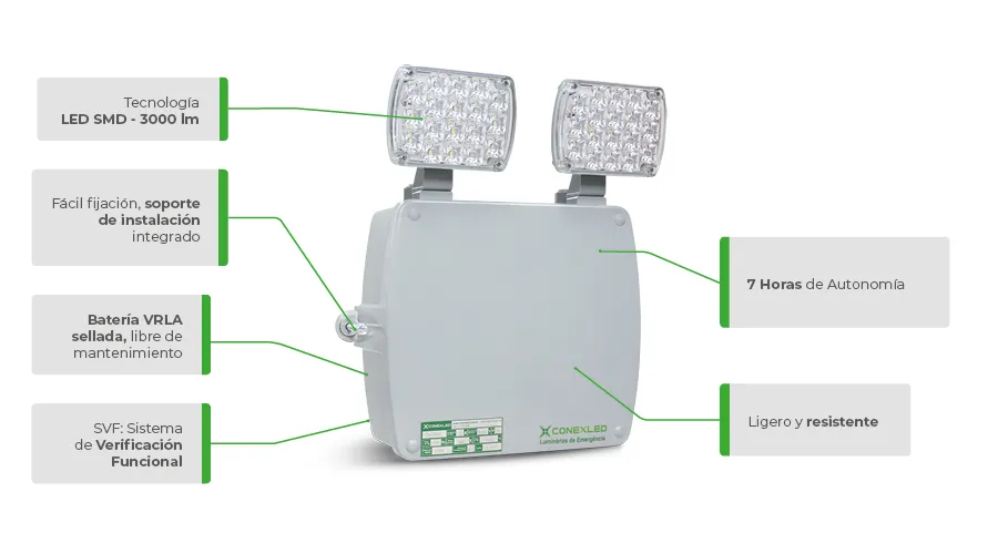 Luminaria de Emergencia Autónoma LED de fácil instalación con 7 horas de autonomía. Ideal para entornos industriales y comerciales, con opción de sensor de luminosidad y verificación automática de funcionamiento.