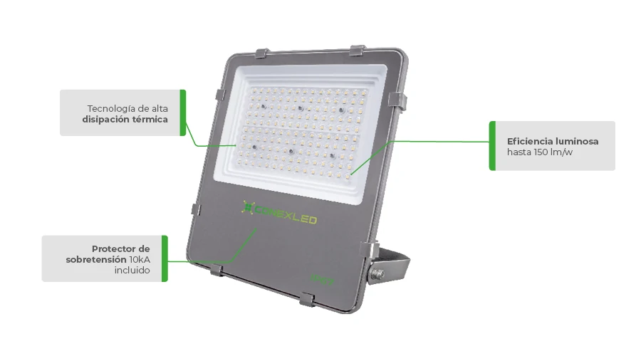 Reflector LED Blindado de alto rendimiento, eficiencia luminosa de hasta 150 lm/W y protección IP67. Ideal para aplicaciones industriales y exteriores.