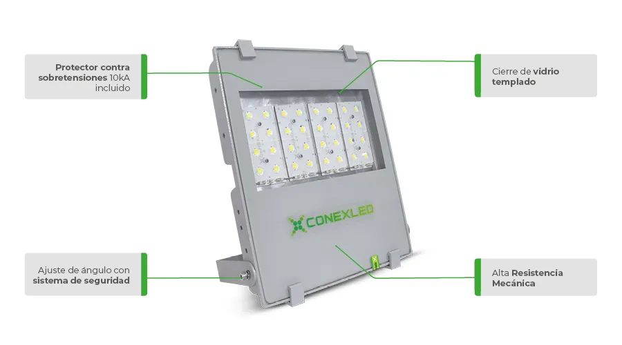 La línea CLRU-P de Conexled ofrece reflectores LED blindados de alto rendimiento con certificación UL, diseñados para aplicaciones industriales y entornos exigentes, tanto interiores como exteriores. Equipados con LEDs Osram® de alta potencia, vidrio templado de 4mm y cuerpo de aluminio inyectado con pintura electrostática, garantizan durabilidad y rendimiento incluso en condiciones extremas. Disponibles en potencias de 31W a 277W, proporcionan una eficiencia luminosa de hasta 143lm/W, vida útil de 100.000h (L70) y protección contra sobretensiones de hasta 10kA. Compatibles con diferentes lentes, temperaturas de color y opciones de voltaje, incluyendo versiones regulables y de alto voltaje (277-480VAC).