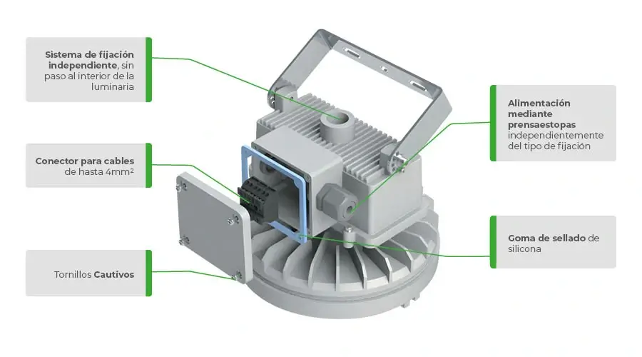 La luminaria LED de la línea Maresias CLTU(F) de Conexled fue desarrollada para ambientes industriales agresivos y no clasificados, ofreciendo resistencia a la intemperie, polvo, vapores y gases. Cuenta con cuerpo de aluminio inyectado, junta de silicona y cierre de cristal templado de 4mm. Está disponible en potencias desde 20W hasta 90W, con un flujo luminoso de hasta 12.500 lm y una eficiencia de hasta 150 lm/W. Tiene protección IP66, resistencia a impactos IK08 y una vida útil estimada de 100.000 horas (L70). Se puede instalar en diferentes posiciones, con soporte a pared, techo, arriostrado o colgado. Ideal para plataformas, refinerías, plantas, ambientes interiores y exteriores.