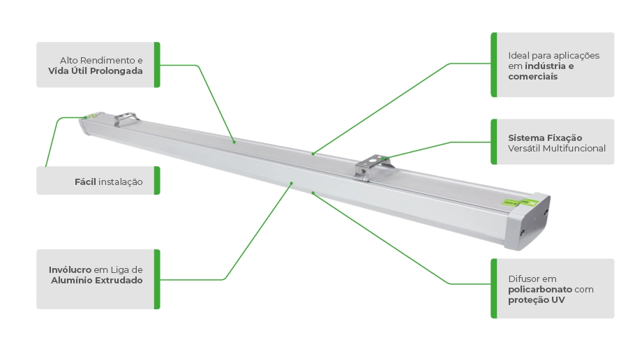 Luminária hermética LED industrial para ambientes agressivos e internos, com certificação UL e eficiência de até 160lm/W.
