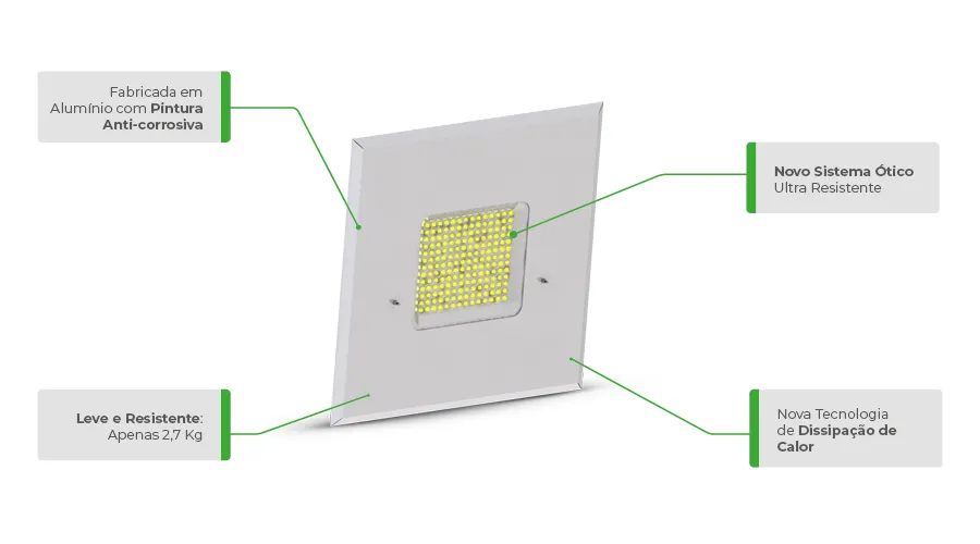 Com modelos de 100W e 150W, a luminária proporciona um fluxo luminoso de até 16.500 lumens, garantindo uma iluminação potente e uniforme. Sua eficiência energética de 110lm/w resulta em significativa economia de energia, reduzindo os custos operacionais. A temperatura de cor de 5000K oferece uma luz clara e brilhante, aprimorando a visibilidade e a segurança nas áreas iluminadas.