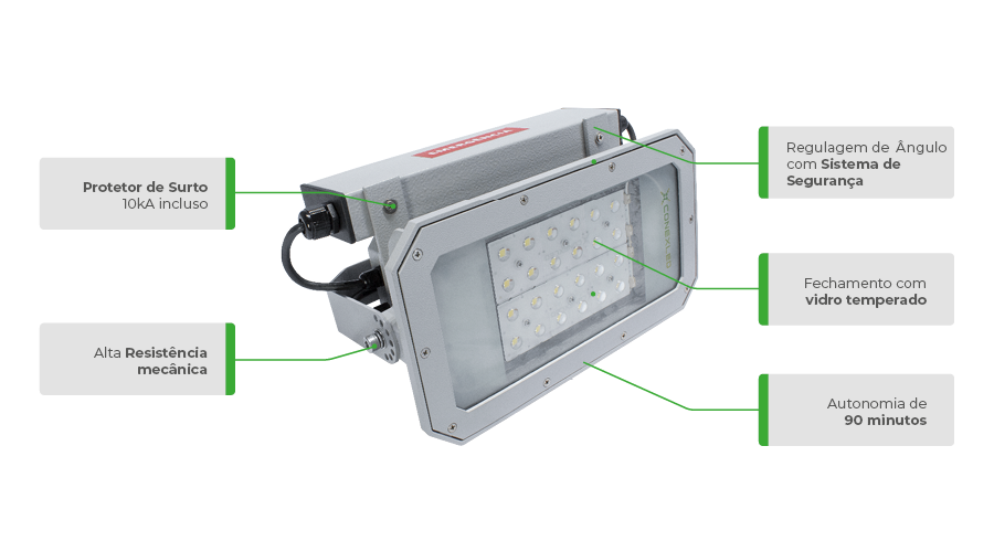 O módulo de emergência integrado sustenta a iluminação por até 90 minutos em caso de falha de energia, com uma eficiência luminosa de até 150 lm/W, garantindo que áreas críticas permaneçam iluminadas durante emergências. Esta característica torna o refletor uma escolha excepcional para aplicações que exigem não apenas performance e durabilidade, mas também uma solução de segurança integrada.