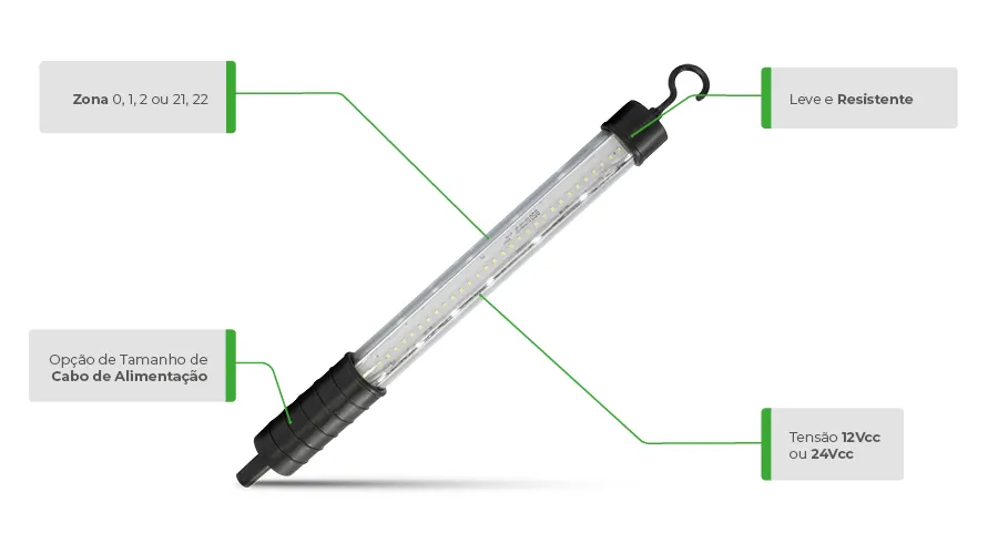Luminária LED Portátil Industrial Ex(CLX) substitui as tradicionais luminárias portáteis com lâmpadas fluorescentes, proporcionando economia de energia e maior tempo de vida útil.
