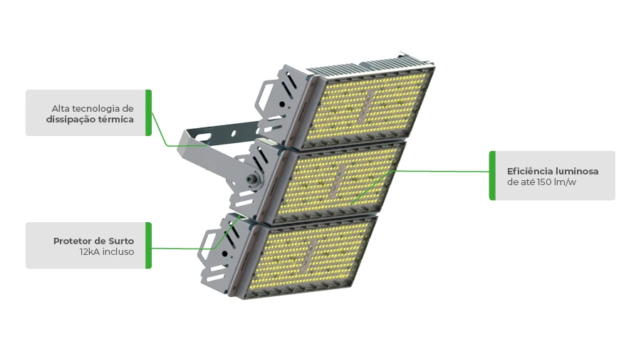 Projetor de alto fluxo luminoso ideal para iluminação de grandes áreas, sistema ótico com facho concentrado e excelente distribuição da luz, reduzindo o ofuscamento e aumentando os índices de iluminação.