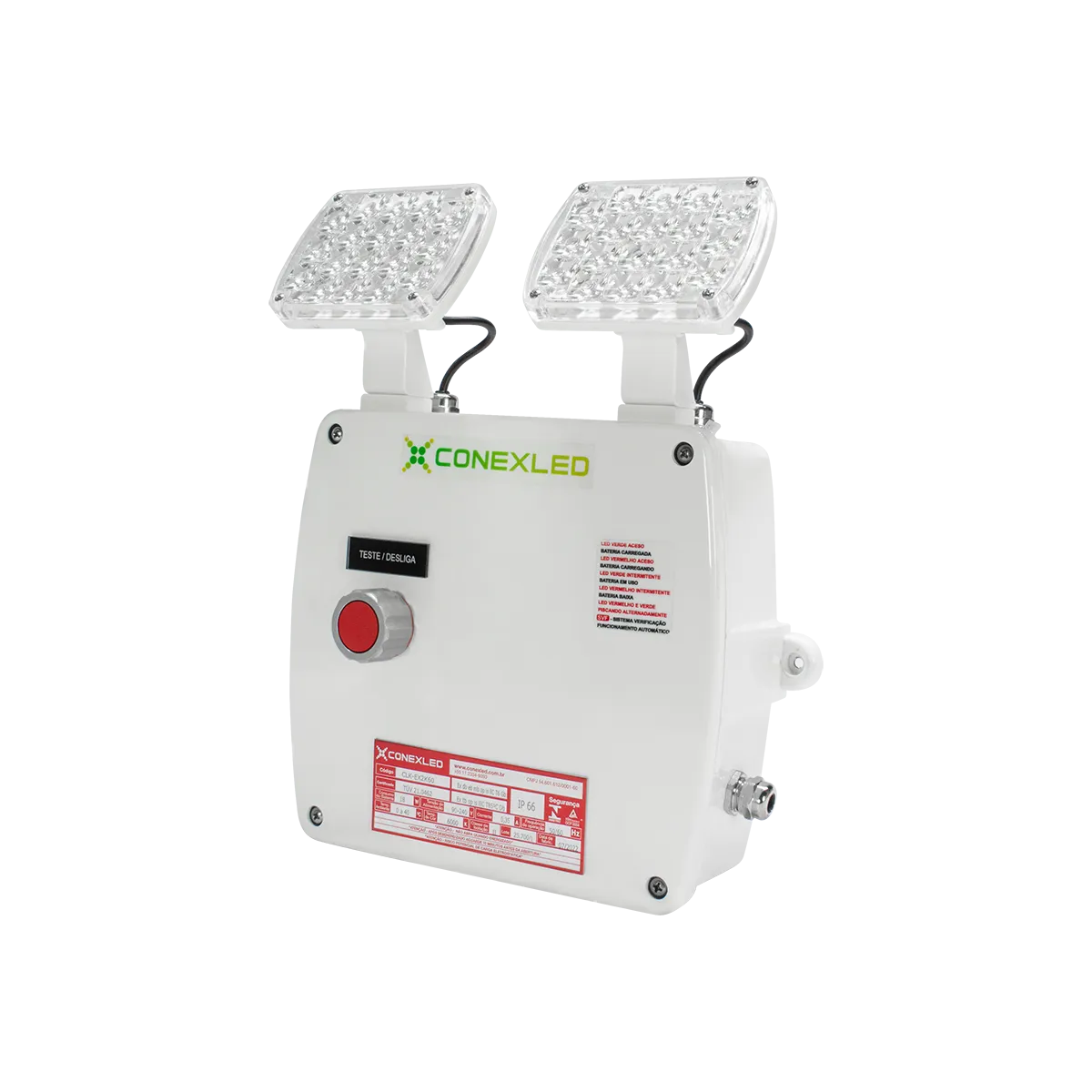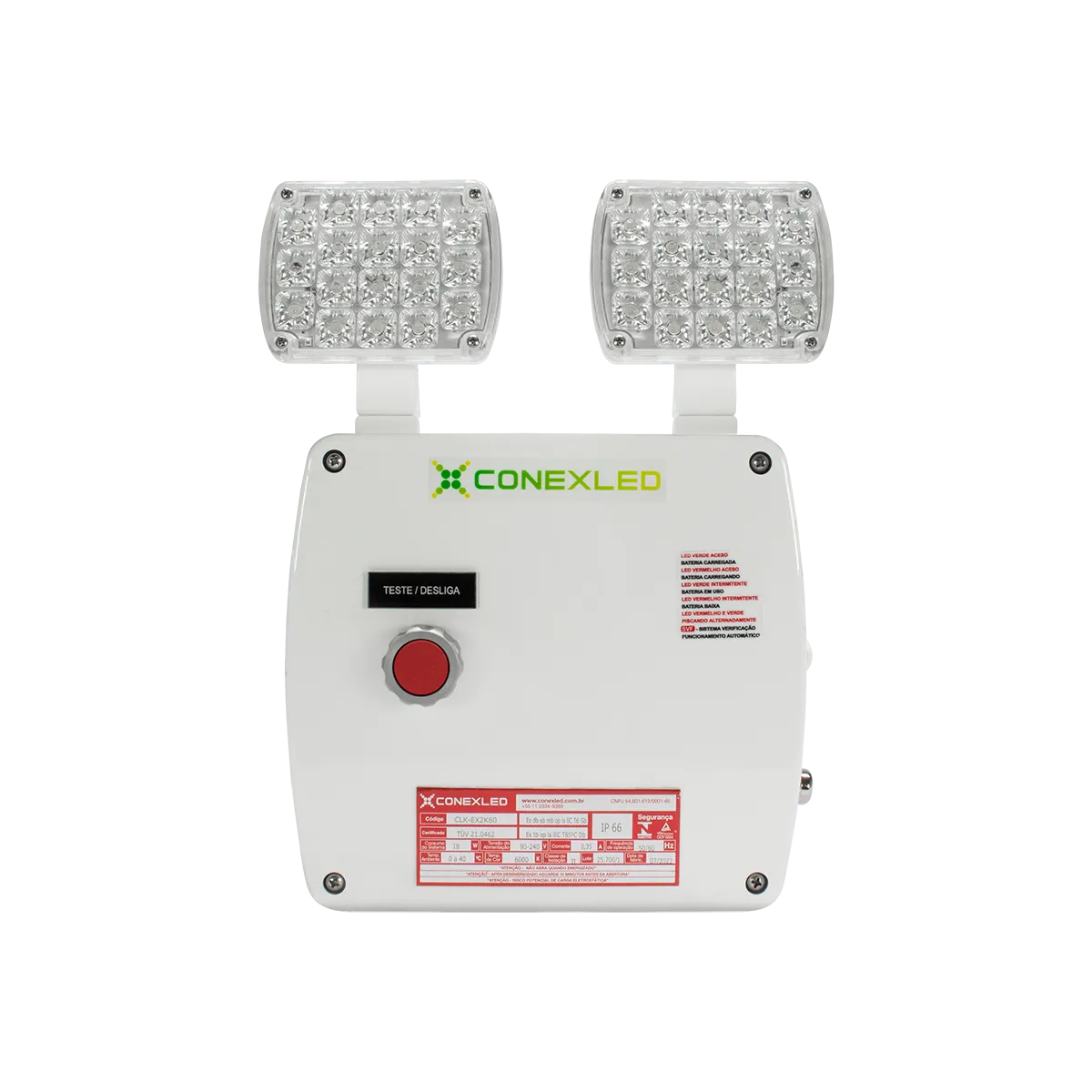 Sistema inovador, fabricado em material termoplástico de alta resistência, a luminária de emergência autônoma LED para atmosferas explosivas da linha Juréia CLK-EX Conexled foi projetada para iluminar ambientes em situação de falta de energia em áreas classificadas de gás e poeira combustível