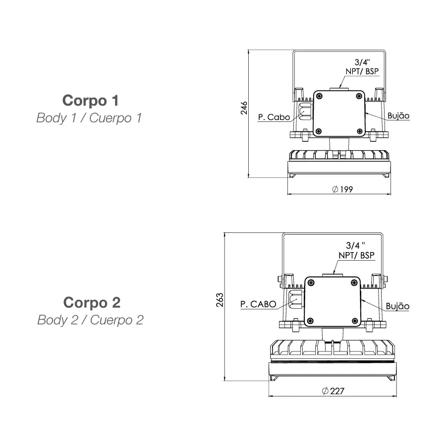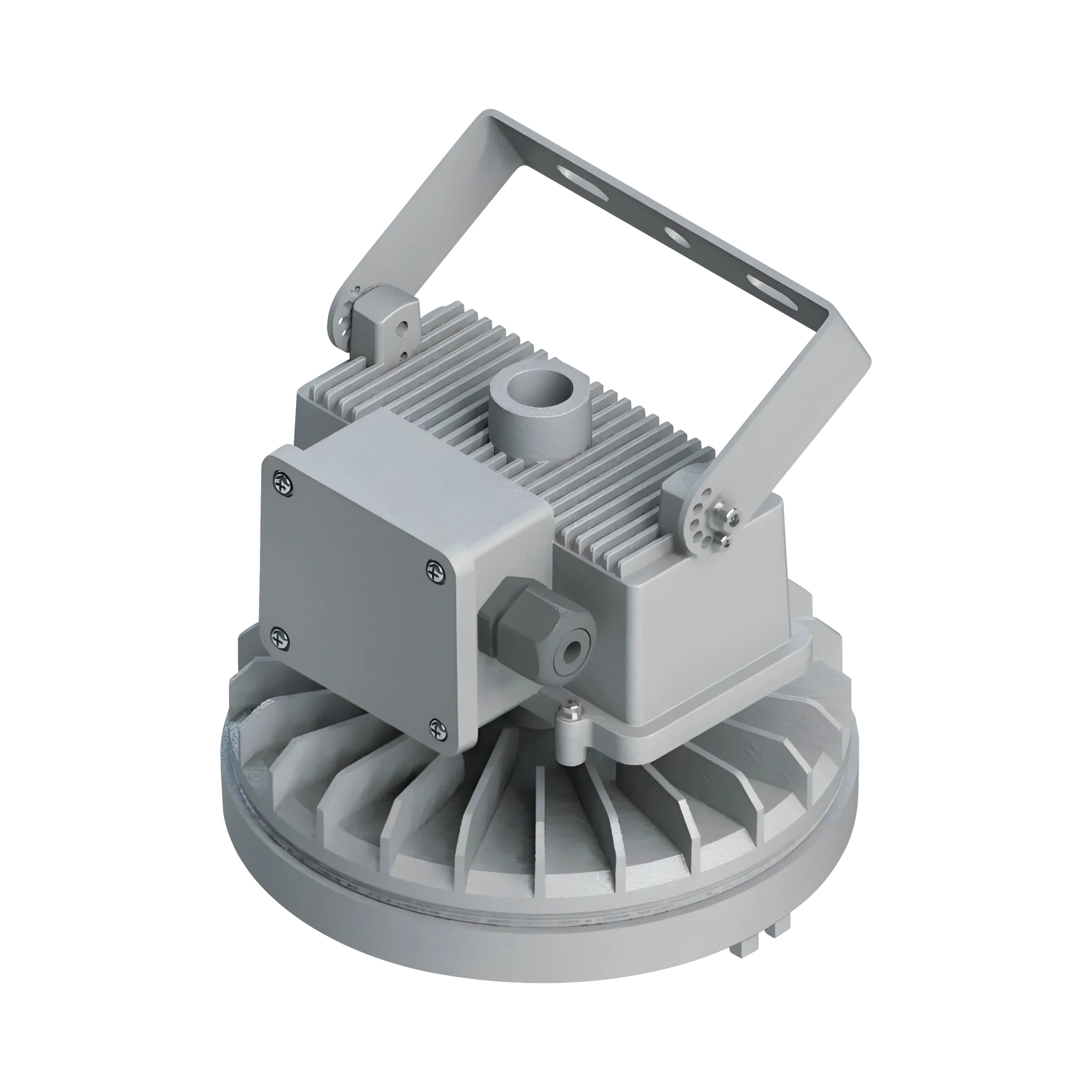 Luminária LED para ambientes industriais severos, com proteção IP66/NEMA 4X, corpo robusto e instalação versátil.