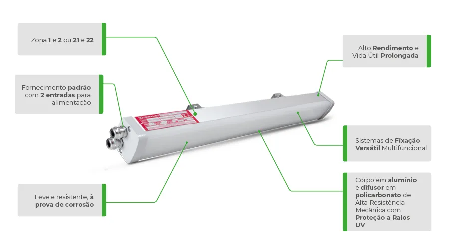 A Luminária LED Linear Ex da linha Pacuíba Conexled substitui as tradicionais luminárias com lâmpadas fluorescentes, proporcionando economia de energia e maior tempo de vida útil. Fabricação do corpo em alumínio e difusor em policarbonato resistente a impactos e raios ultra violeta, suportes de fixação em aço inoxidável, o produto é adequado para utilização em áreas classificadas com atmosferas explosivas zona 1 e 2 ou 21 e 22, em plataformas offshore, onshore, refinarias, indústrias petroquímicas, químicas, alimentícias, farmacêuticas, módulos de abastecimento, unidades de acetileno, hidrogênio, tintas, vernizes, depósitos inflamáveis e etc.