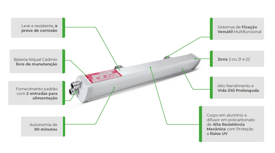 A Luminária Linear para Atmosferas Explosivas com Módulo de Emergência da linha Pacuíba CLB-EX2 Conexled substitui as tradicionais luminárias com lâmpadas fluorescentes, proporcionando economia de energia e maior tempo de vida útil. Funcionamento com alimentação convencional e em modo de emergência com utilização de baterias. Fabricação do corpo em alumínio e difusor em policarbonato resistente a impactos e raios ultra violeta, suportes de fixação em aço inoxidável, o produto é adequado para utilização em áreas classificadas com atmosferas explosivas zonas 2 ou 21 e 22, em plataformas offshore, onshore, refinarias, indústrias petroquímicas, químicas, alimentícias, farmacêuticas, módulos de abastecimento, unidades de acetileno, hidrogênio, tintas, vernizes, depósitos inflamáveis e etc.