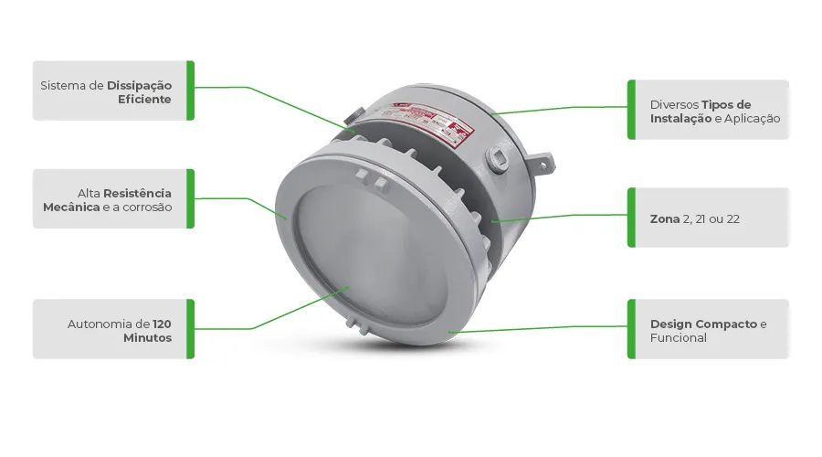 A Luminária à Prova de Explosão com Módulo de Emergência CLY-E – Linha Perequê é ideal para atmosferas explosivas, oferecendo alta resistência e eficiência em ambientes industriais severos.