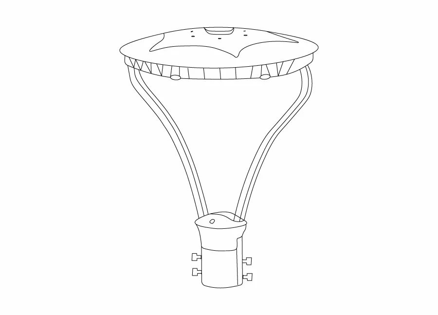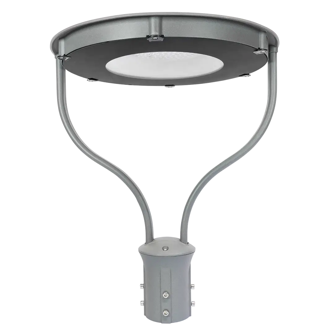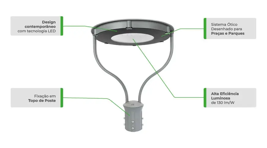 Luminária decorativa LED para áreas externas, com design moderno, difusor de vidro temperado e eficiência luminosa. Ideal para praças, parques e estacionamentos.