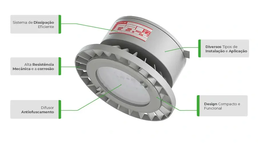 O corpo da luminária é construído em alumínio fundido de alta resistência, com um sistema de dissipação térmica eficiente e visor em vidro temperado de 4mm ou policarbonato. A luminária possui grau de proteção IP66, assegurando vedação contra poeira e jatos de água, e grau de impacto IK08, tornando-a robusta e resistente a impactos.
