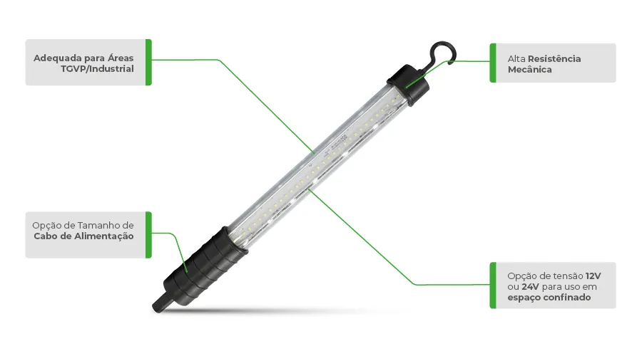 A Luminária LED Portátil Industrial da linha Tapirema Conexled substitui as tradicionais luminárias portáteis com lâmpadas fluorescentes, proporcionando economia de energia e maior tempo de vida útil, conforme L70, 30.000 horas. Construção robusta, punho e gancho de fixação em borracha especial, o produto é adequado para uso em locais sujeitos a gases, poeiras, vapores e pós. Utiliza tecnologia LED ideal para inspeção e manutenção de áreas industriais. Podem ser fornecidas com alimentação bivolt, 12VCC ou 24VCC.