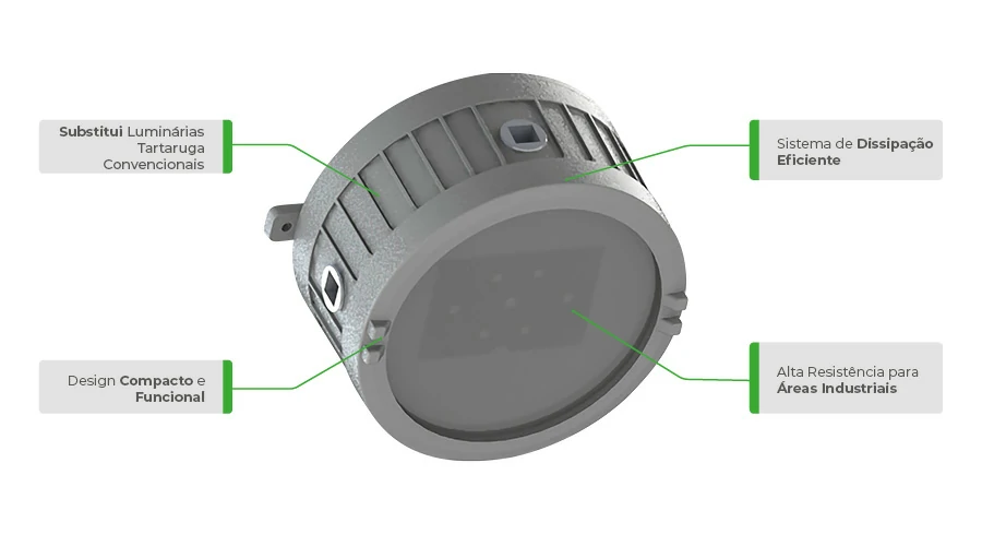 A linha Tijucopava Conexled foi projetada para áreas industriais que requerem proteção às ações do tempo, gases, vapores e pós (TGVP) substituindo as tradicionais Luminárias arandelas tipo TARTARUGA. Corpo fabricado em alumínio fundido de alta resistência mecânica e à corrosão, possui eficiente dissipação térmica, garantindo maior durabilidade da vida útil do LED e da fonte de alimentação (driver). Grau de proteção IP66, fixação das tampas através de rosqueamento e junta de silicone flexível para altas temperaturas. Acabamento com pintura eletrostática especial na cor cinza claro, com propriedades técnicas para garantir maior eficiência na dissipação e distribuição do calor emitido pelos componentes eletroeletrônicos. Utiliza LED Mid Power LumiLed® e fonte de alimentação para uso industrial.