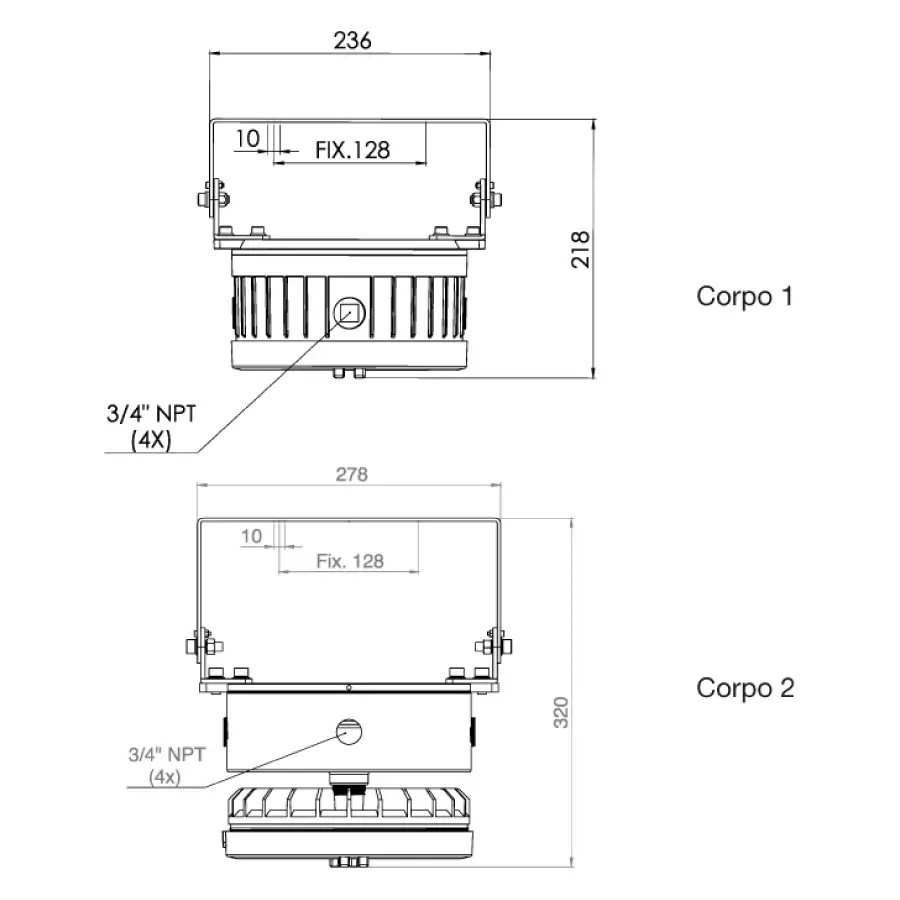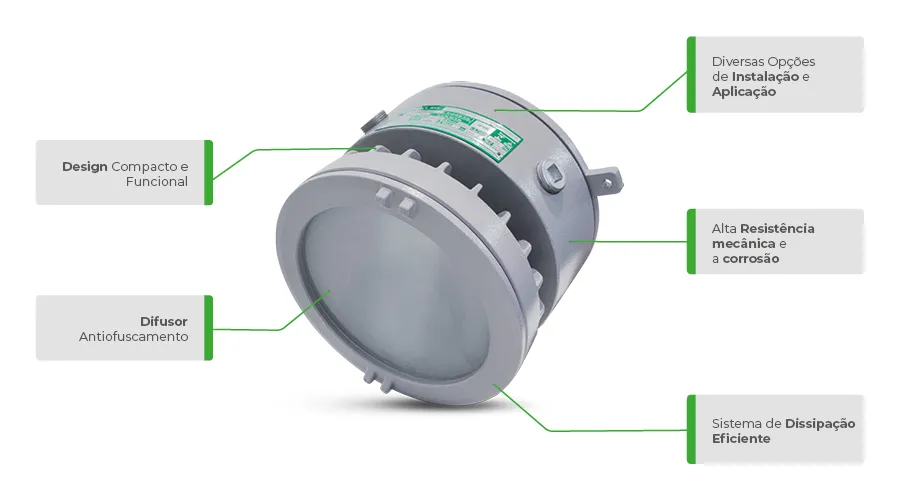 O corpo da luminária é construído em alumínio fundido de alta resistência, e o visor padrão é em vidro temperado de 4mm, com opção de policarbonato. A luminária possui grau de proteção IP66, assegurando vedação contra poeira e jatos de água, e grau de impacto IK08, tornando-a robusta e resistente a impactos.